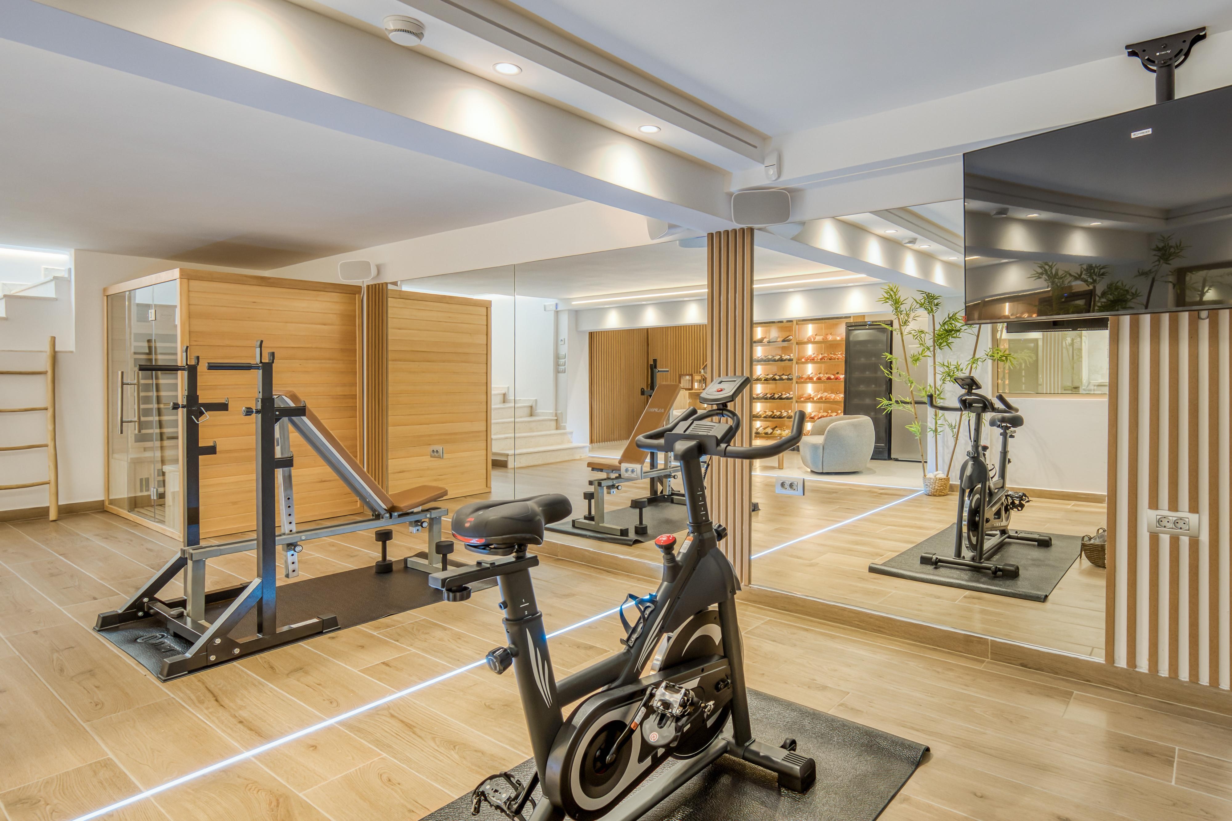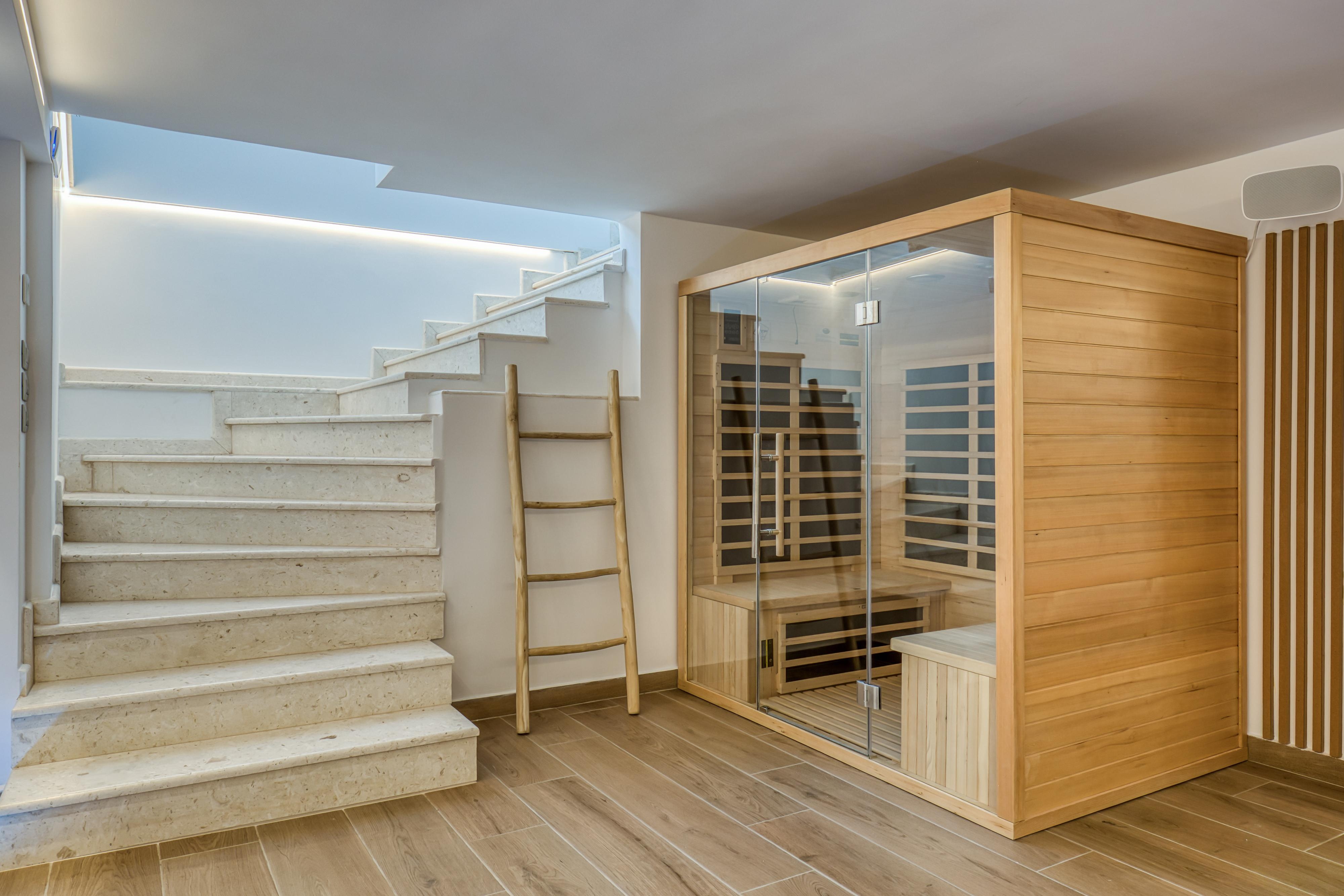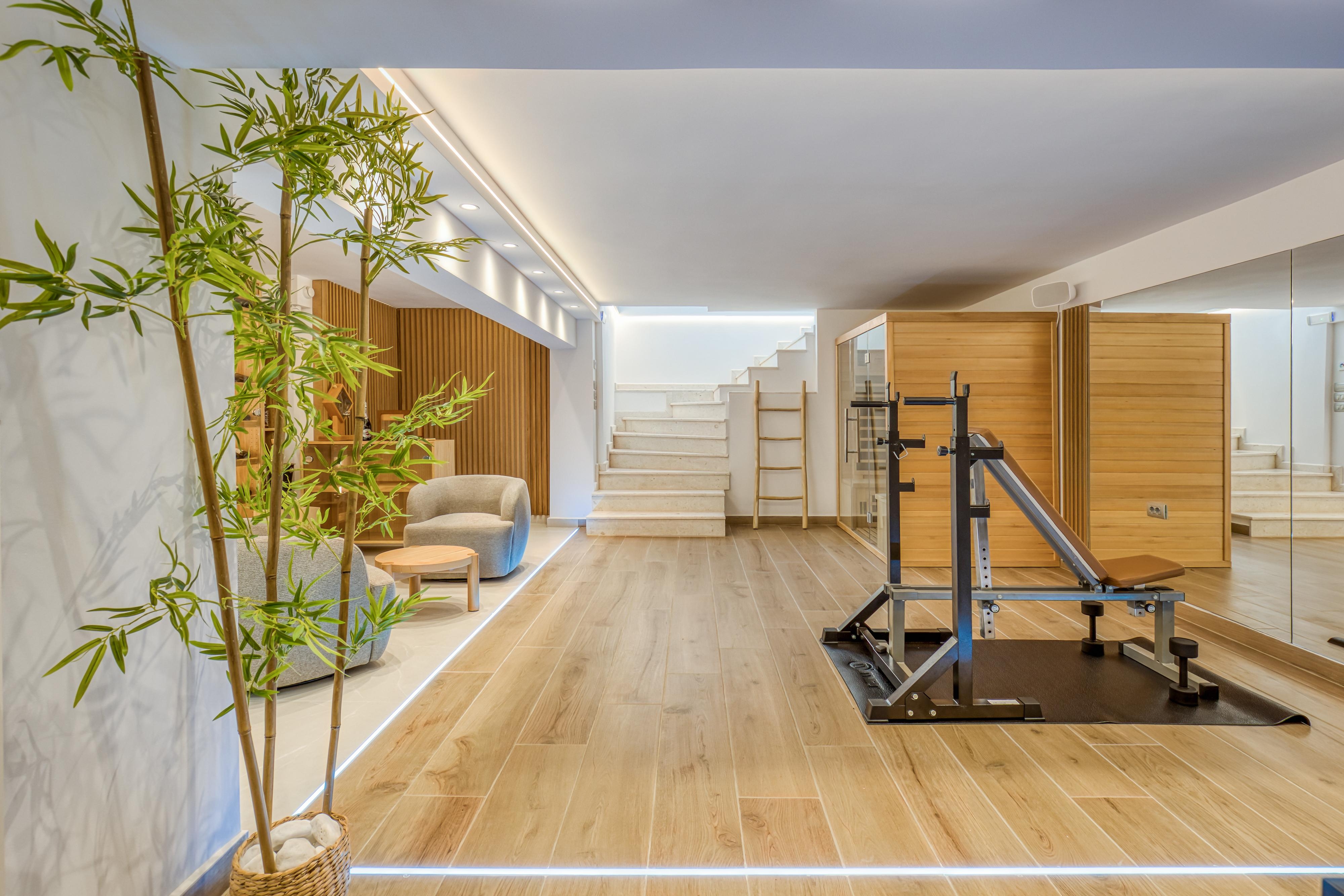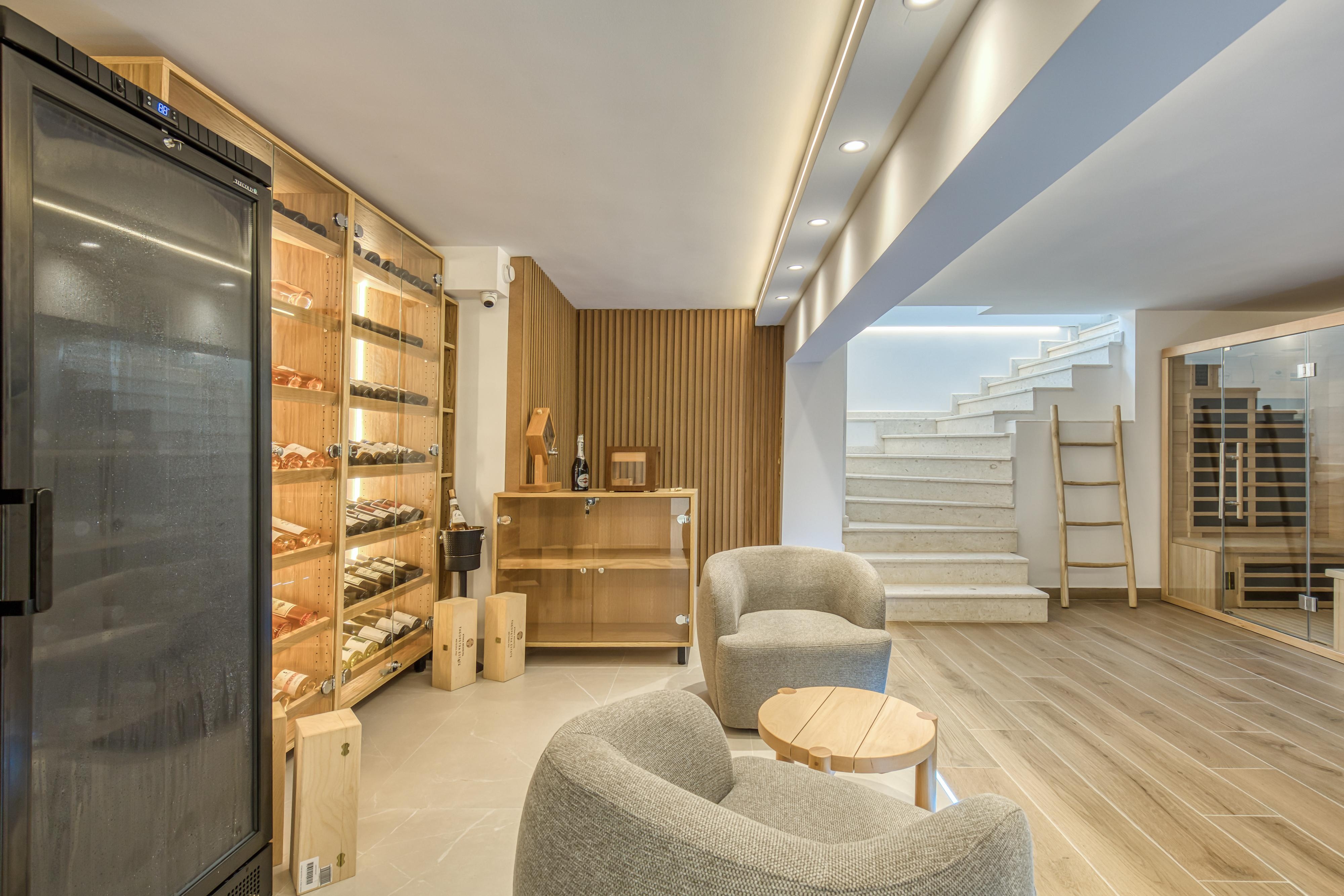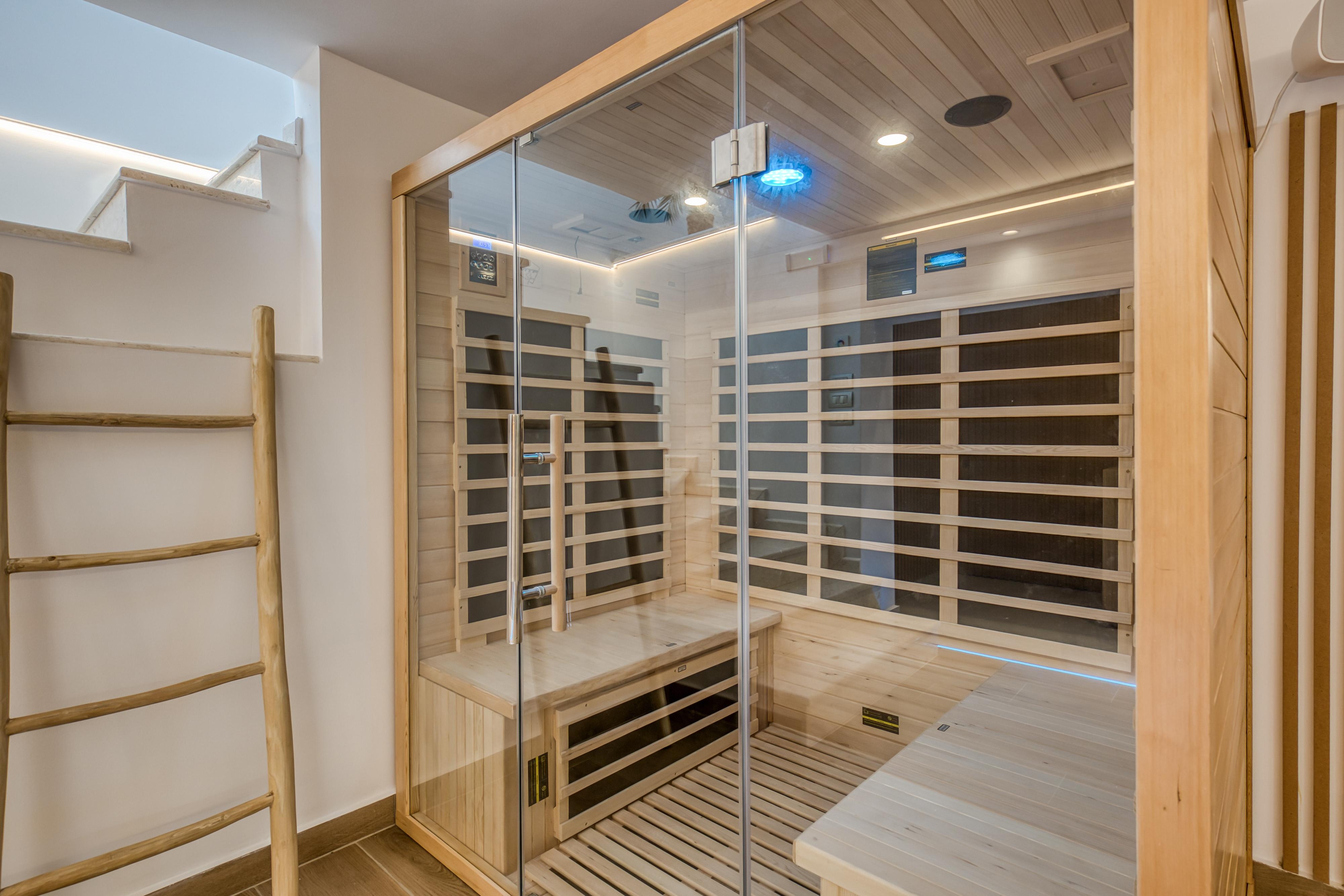 • The wellness zone, including an infrared sauna, fully equipped gym, and a custom wine cellar